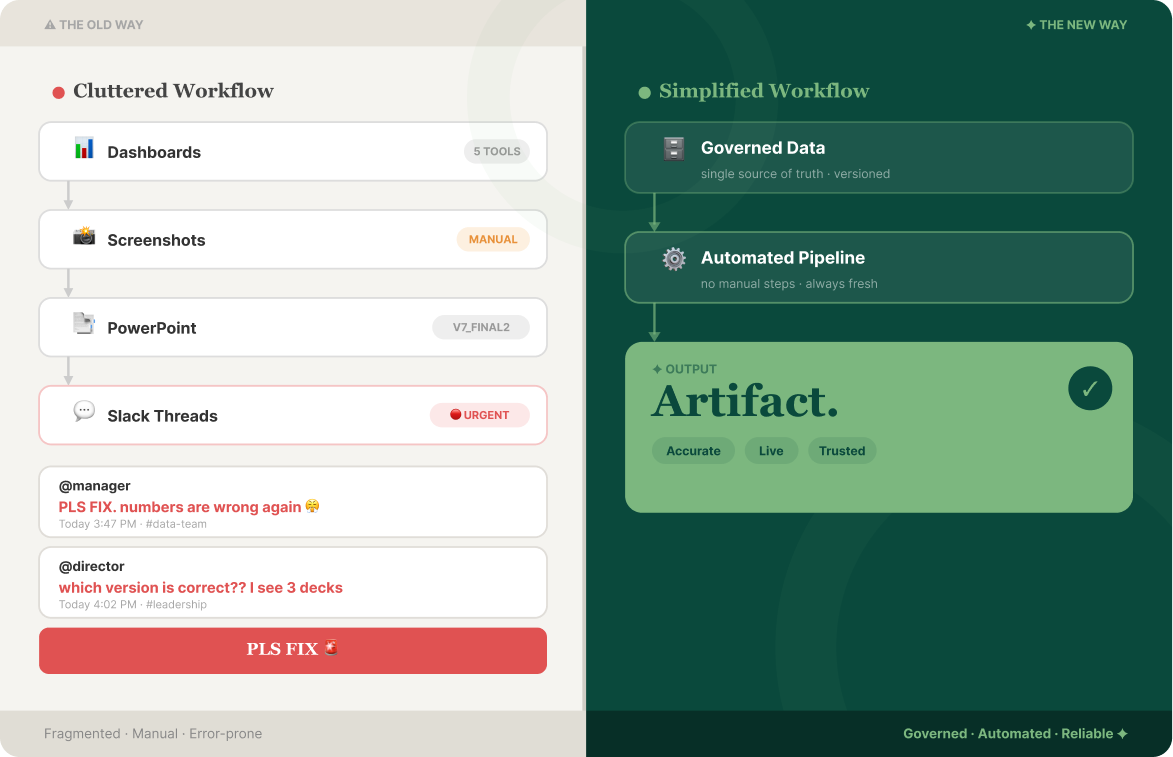 Each Artifact uses your approved metric definitions and business logic. No disconnected exports. No inconsistent numbers. No duplicated effort.